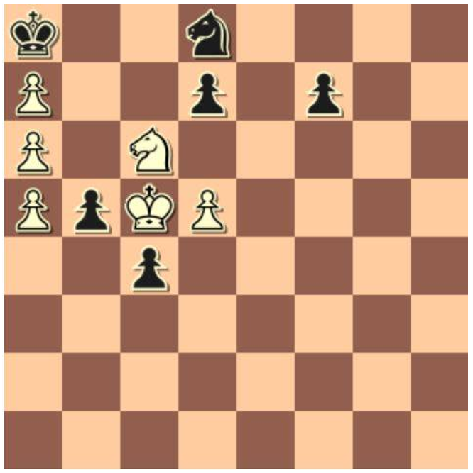 It seems like white is able to grab a knight for free. However, that would be not a wise idea, as the c4 pawn would then be free to run down to become a queen. You can easily convince yourself that 1.Nxd8? c3! wins for black. White also has its own knight en prise in the starting position, so a move not involving a knight move will result in its demise. E.g., 1.Kb6 seems a desirable attacking move to make, but 1....dxc6 2.dxc6 Nxc6! again turns the tables.